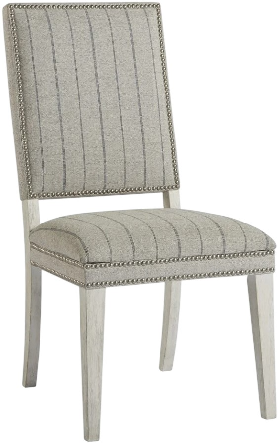 The Hamptons Dining Chair features a tall, slender silhouette upholstered in a finely striped fabric, strong tapered legs and a delicate nail head trim. Designed for comfort and durability, it offers supportive seating for everyday dining. Its refined details and neutral tones bring a light, elegant presence to any dining space.Read More