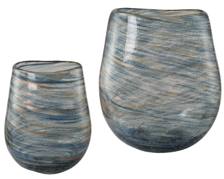 Immerse yourself in the mesmerizing swirled pattern of blue and gold that gracefully adorns these clear bubble glass vases. The delicate dance of colors creates a captivating visual spectacle, making these vases a true statement piece versatile enough to stand alone or to showcase your favorite blooms.Read More