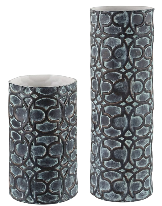 Set of two ceramic vases feature a raised pattern finished in an aged bronze patina with verdigris glaze. The glazed white interior completes the look while also making these water tight for displaying cut flowers.Read More