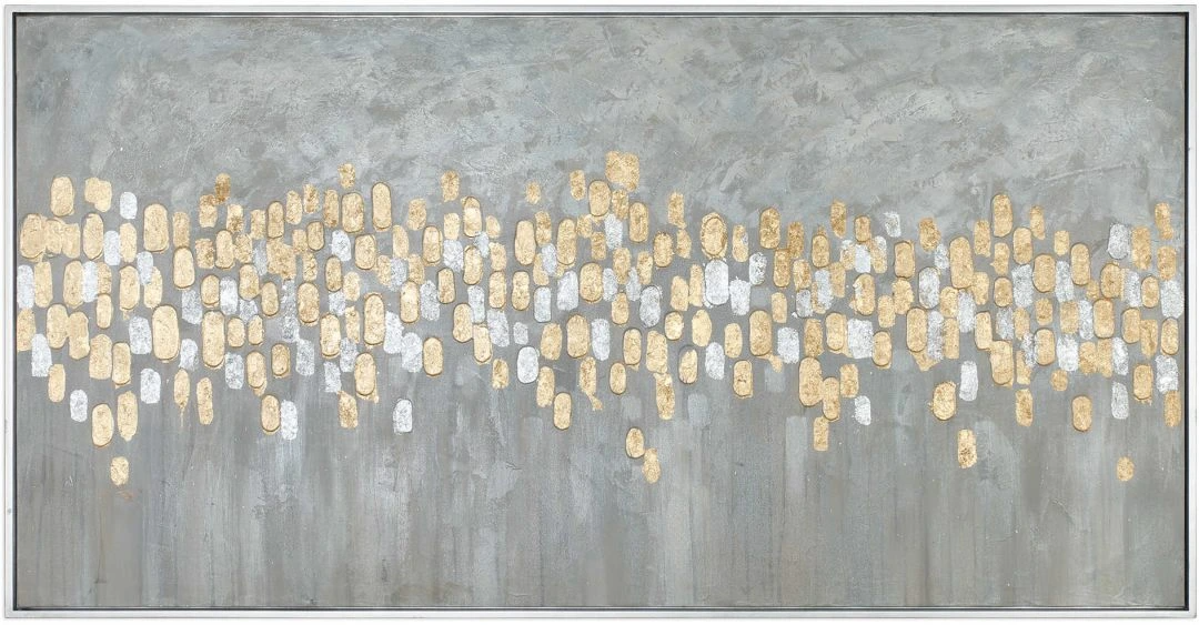 This hand painted artwork on canvas emanates contemporary style, with a modern edge. A textured, gray and taupe background is accented by bright, metallic gold and silver leaf raised bars. The eye-catching abstract is stretched and applied to a wooden frame.Read More
