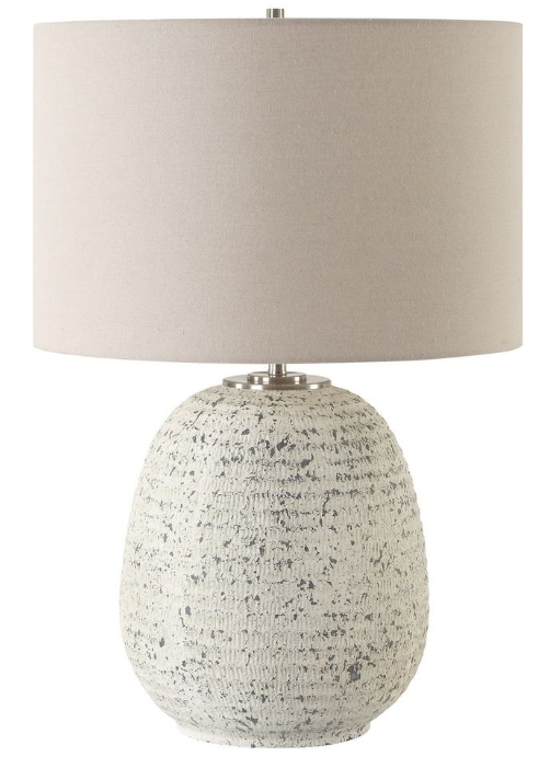 This ceramic table lamp boast a ribbed textured surface finished in a heavily distressed stone ivory with dark gray undertones. Accentuated by brushed nickel plated details, this lamp exudes rustic elegance and charm. The round hardback drum shade is a casual light beige linen fabric with natural slubbing.Read More
