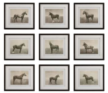 This regal set showcases nine antiqued sketches of horses belonging to dignitaries and elite members of society. Surrounded by a beveled wood grain frame in a walnut finish and a crisp white linen liner. Each print is placed under protective glass.Read More