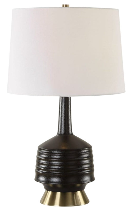 This table lamp features a ribbed ceramic base adorned in a lightly textured black glaze, displayed on a plated antique brass tapered foot. The tapered round hardback shade is covered in a crisp white linen fabricRead More