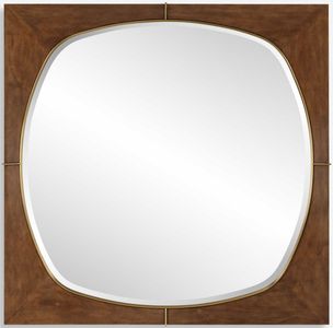 The Garonne Square Mirror features a solid pine wood frame, with an antiqued walnut stain wash. Its profile boasts a subtle slope for added allure, complemented by stainless steel details finished in plated brass. The mirror has a generous 1" shaped bevel.Read More