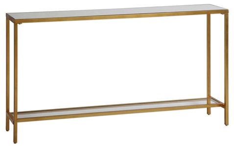 Classic and minimalistic, this narrow console table in iron is finished with lightly antiqued gold leaf, inset with a beveled mirrored top, and gallery shelf in clear glass. This table embodies Uttermost’s commitment to quality craftsmanship and timeless style, making it a versatile investment for any home.Read More