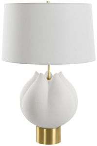 Inspired by budding flowers, the In Bloom Table Lamp features a porcelain body with subtle texture, finished in a chalk white glaze paired with lightly antiqued brass plated details. The tapered round hardback shade completes the piece in a casual white linen fabric.Read More