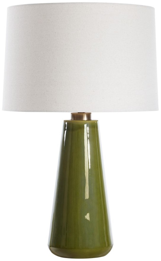 This timeless ceramic lamp is finished in a crackled moss green glaze that's accented with antiqued brass plated details. The round hardback drum shade is an oatmeal linen fabric with light slubbing.Read More