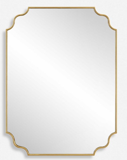 Elevate your space with this updated traditional mirror featuring a petite frame, adorned with graceful curves, finished in a lightly antiqued gold leaf adding a touch of timeless elegance to any room. May be hung horizontal or vertical.Read More