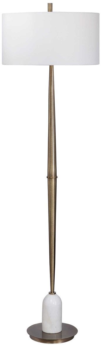 Transitional in design, this floor lamp has a tapered base finished in a plated antique brass, accented with a polished white marble detail. The piece has a white linen hardback drum shade.Read More