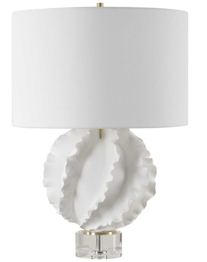 This ceramic table lamp is finished in a satin white glaze featuring gracefully flowing deep ridges, accented with brass plated details and a thick crystal foot. The round drum shade is covered in a crisp white linen fabric.Read More