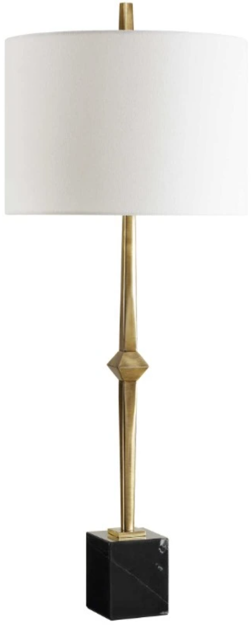 The Suranne Table Lamp features a slender metal column in a sophisticated plated antique brass finish, standing proudly on a robust block of black marble with subtle veining. The round hardback drum shade is a finished in a crisp white linen.Read More