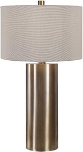 Finished in an antiqued brushed brass, this table lamp keeps it simple yet upscale with a large metal cylinder base with matching accents. The hardback drum shade is finished in a beige linen fabric.